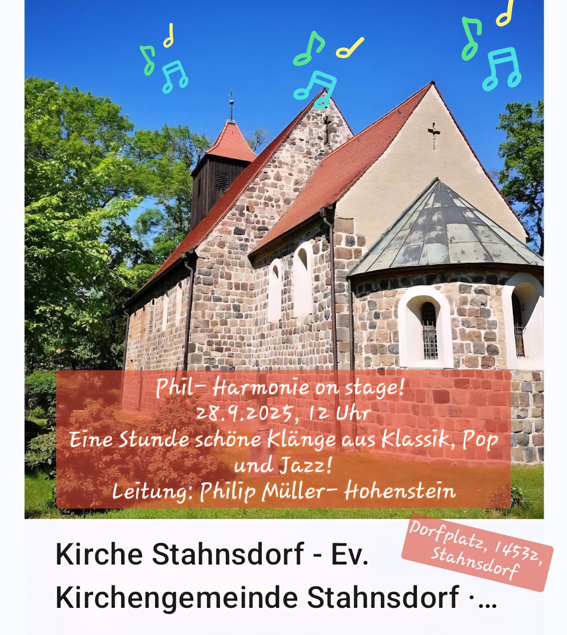 Am 28.09.2025 präsentierte der Chor Phil-Harmonie unter der Leitung von Philip Müller-Hohenstein in unserer Dorfkirche in Stahnsdorf „Eine Stunde schöne Klänge aus Klassik, Pop und Jazz“. Die Begeisterung der Zuhörerinnen und Zuhörern wurde durch den lang anhaltenden Applaus zum Ausdruck gebracht. (Ankündigung)